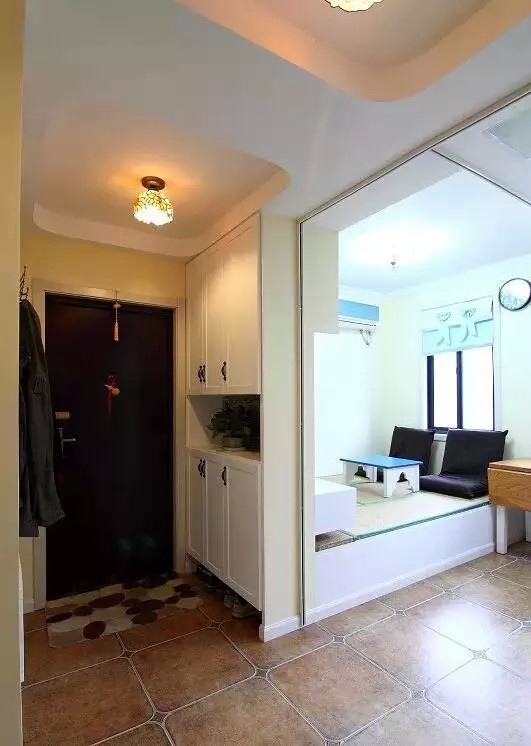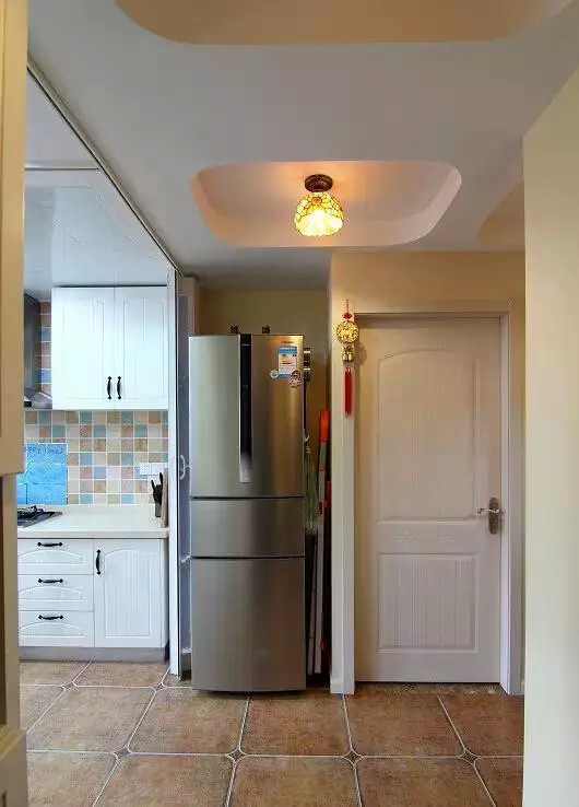 進(jìn)門的玄關(guān),做了一個很大的鞋柜,冰箱放在了對門的位置,量房熱線:0551-63732980